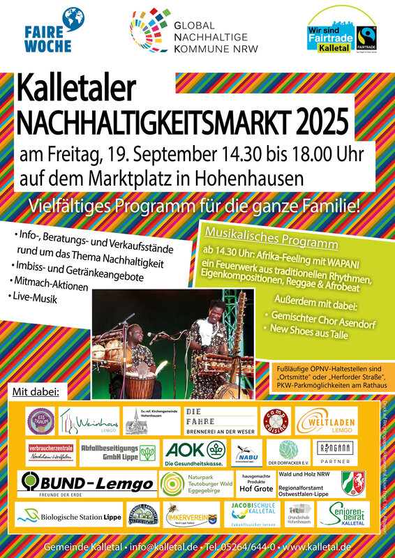 | Kalletaler Nachhaltigkeitsmarkt - Fr, 19.09. von 14.30 bis 18.00 Uhr WAS: Klönen & Genießen auf dem Marktplatz - mit buntem Rahmenprogramm: - Aktions-, Info- und Verkaufsstände für die ganze Familie mit Verköstigung, Musik, uvm. WO: Marktplatz Hohenhausen, Am Markt, 32689 Kalletal |