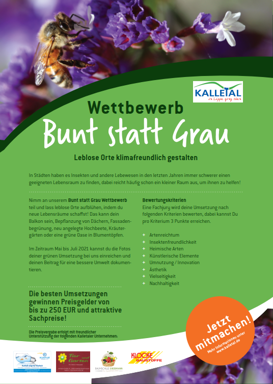 Beim diesjährigen Gartenwettbewerb sind kreative Ideen aus Garten, Balkon, Beet, Blumentopf & Co. gefragt, die das eigene Umfeld bunter machen und ökologisch aufwerten. Einsendeschluss ist der 31. Juli. Weitere Informationen und die Teilnahmebedingungen finden Sie im Abschnitt Gartenwettbewerb 2021.