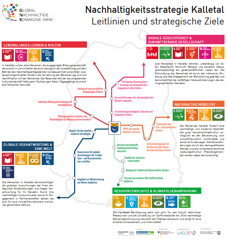 Die Gemeinde Kalletal hat mittels einer Steuerungsgruppe bestehend aus Mitgliedern aus Zivilgesellschaft, Politik, Wirtschaft, Wissenschaft und Verwaltung von Sommer 2019 bis Herbst 2020 im Rahmen des Projekts Global Nachhaltige Kommune NRW (GNK NRW) ihre kommunale Nachhaltigkeitsstrategie erarbeitet. Im Februar 2021 hat der Gemeinderat Kalletal die Nachhaltigkeitsstrategie einstimmig beschlossen.