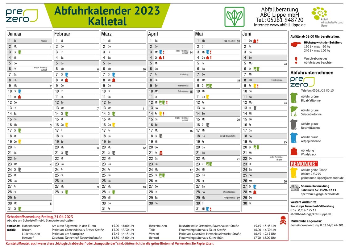 Haushalte aus allen lippischen Kommunen mit Ausnahme von Detmold, die bis Ende Dezember keinen Abfuhrkalender bekommen haben, können vom 30. Dezember 2022 bis zum 13. Januar 2023 per E-Mail unter der Adresse abfuhrkalenderlippe@prezero.com oder der Rufnummer 0 52 61 / 25 80 30 einen Abfuhrkalender als Datei nachbestellen.