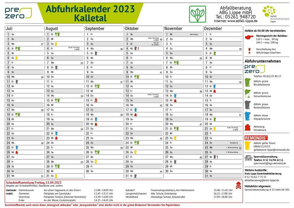 Neben allen relevanten Terminen erhalten die Bürgerinnen und Bürger eine Übersicht nützlicher Adressen und Telefonnummern. Pro Haushalt ist jeweils ein Exemplar vorgesehen. Für den weiteren Bedarf stehen die Kalender auch als Datei auf den Internetseiten des Abfallwirtschaftsverbandes Lippe (AWV Lippe) https://abfall-lippe.de/ bereit.