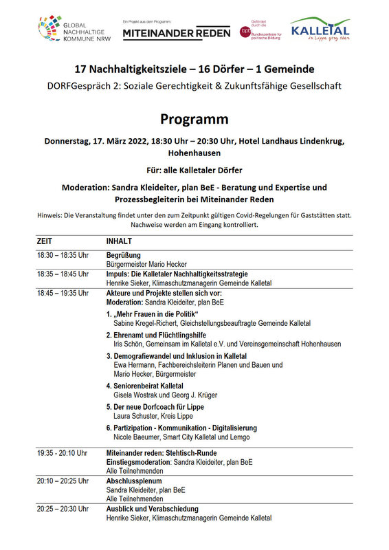 Das Thema der aktuellen Veranstaltung ist das Handlungsfeld „Soziale Gerechtigkeit & Zukunftsfähige Gesellschaft“ der Nachhaltigkeitsstrategie. In diesem Handlungsfeld will Kalletal die gleichberechtigte Teilhabe am gesellschaftlichen Leben für alle erreichen, den Einbezug der Bevölkerung bei der gemeindlichen Entwicklung stärken und die Herausforderungen des demografischen Wandels meistern.