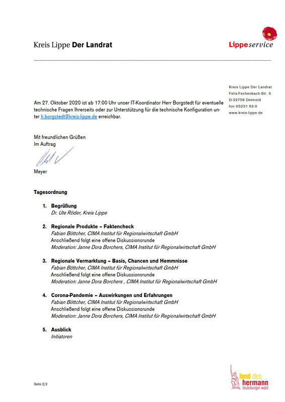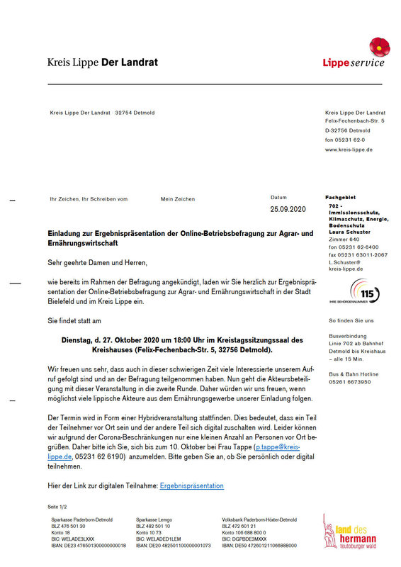 Der Kreis Lippe und die Stadt Bielefeld haben eine Umfrage zur lokalen Agrar- und Ernährungswirtschaft durchgeführt. Das Ergebnis wird auf einer Hybrid-Veranstaltung am 27. Oktober im Kreissitzungssaal des Kreishauses präsentiert. Weitere Informationen sind dem Schreiben zu entnehmen.