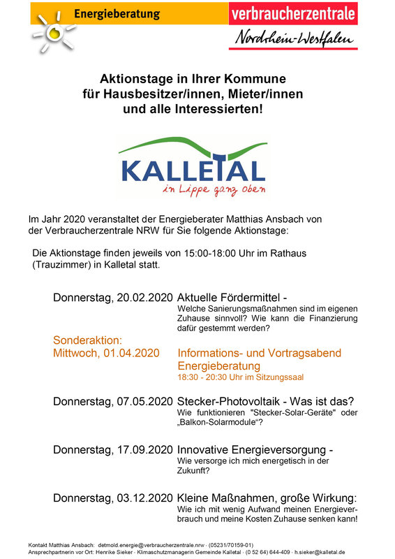 Im Jahr 2020 veranstaltet der Energieberater Matthias Ansbach von der Verbraucherzentrale NRW für Sie folgende Aktionstage:
