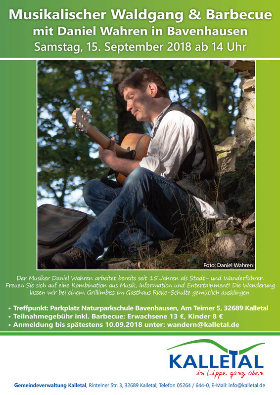 Auf der ca. 5 km langen Wanderung rund um Bavenhausen, welche um 14 Uhr an der Naturparkschule Bavenhausen startet, begleitet Musiker Daniel Wahren aus Detmold die Wandergruppe.