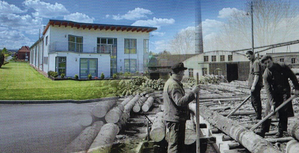 Gestern und heute: Die Fotomontage zeigt die heutige Industriebuchbinderei und das abgerissene Sägewerk nebeneinander
