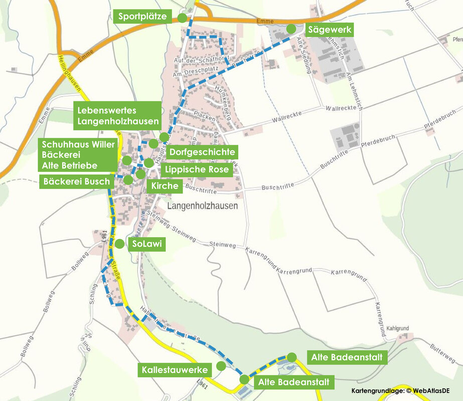 Infotafeln am Wegesrand in Langenholzhausen bieten daher über QR Codes einen Zugang zu Texten, Fotos, Audioaufnahmen und Videos zu 13 Standorten. Darunter der Ort, wo bis 2005 noch ein Sägewerk und jetzt die Industriebuchbinderei Nordlippe steht oder bis zum zweiten Weltkrieg die alte Badeanstalt in Langenholzhausen zu finden war. Hier erfahren Interessierte mit dem Scannen des QR Codes neben allgemeinen Informationen zur Badeanstalt, warum trotz großem Becken und zwei Sprungbrettern, der Badebetrieb meist am Beckenrand stattfand. Oder wie es gelang, ohne den einen Groschen Eintritt zu zahlen, Einlass ins Freibad zu bekommen. Anekdoten wie diese und viele weitere Wissensschätze aus der Dorfgeschichte steuerten Zeitzeugen aus Langenholzhausen bei.